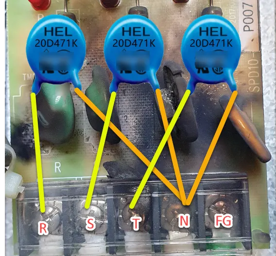 SPD10 R-N / S-N / T-N 선간 전압인 220V에 대한 써지 보호소자이니 TNR391~471 정도의 Varistor 를 임시로 달아서 사용할 수 있습니다.
