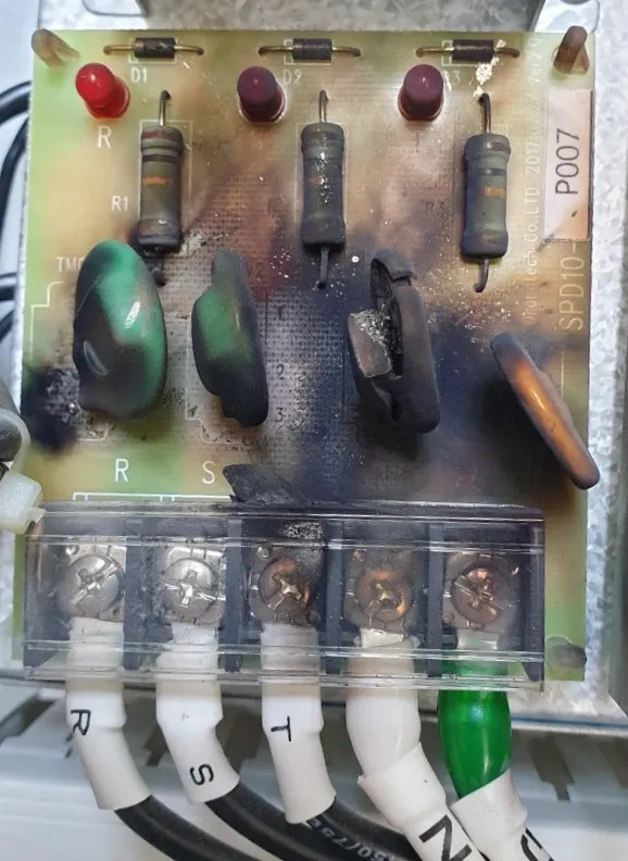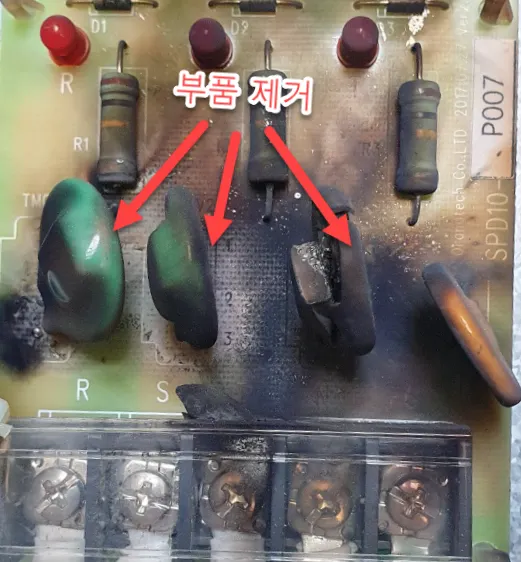 중간에 이상하게 생긴 소자가 터져서 문제가 되는데 해당 소자는 [전원 모니터링이 있는 써지 보호 소자] 로 TMOV 라는 품명을 가지고 있습니다.