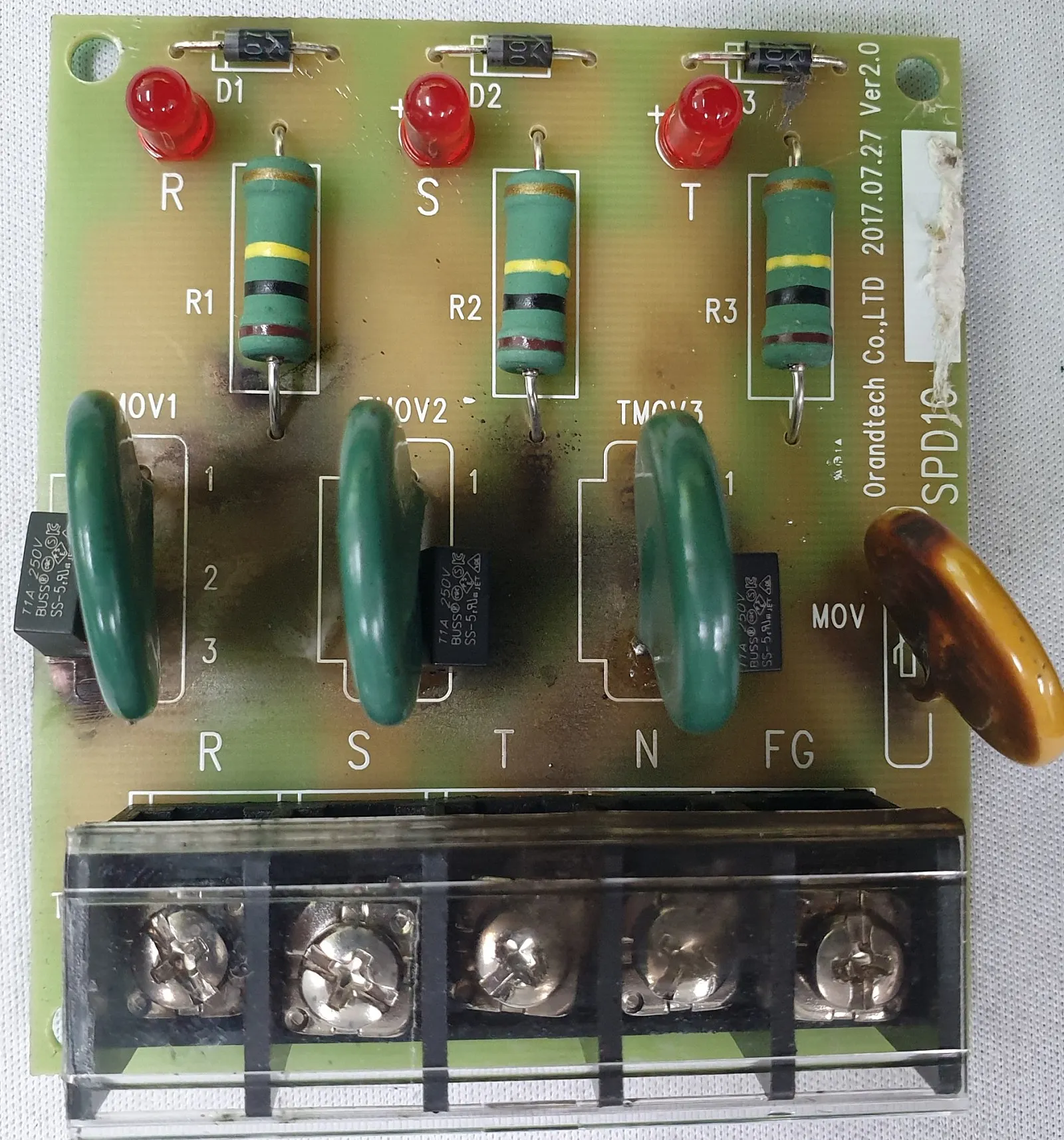 해당 보드는 입력 R, S, T 상에서 발생되는 써지를 보호하며, 입력 전원이 정상으로 들어오고 있는지 LED 를 통해 모니터링을 해주는 보드입니다.